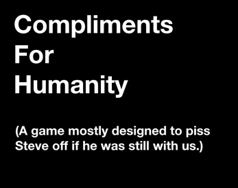 A print and play game I made in tribute of Steve Dee of Tin Star Games who passed away recently. Apparently at some point I joked with him about making an anti "Cards Against Humanity" where you say nice things about your friends instead. Felt right to make it exist.